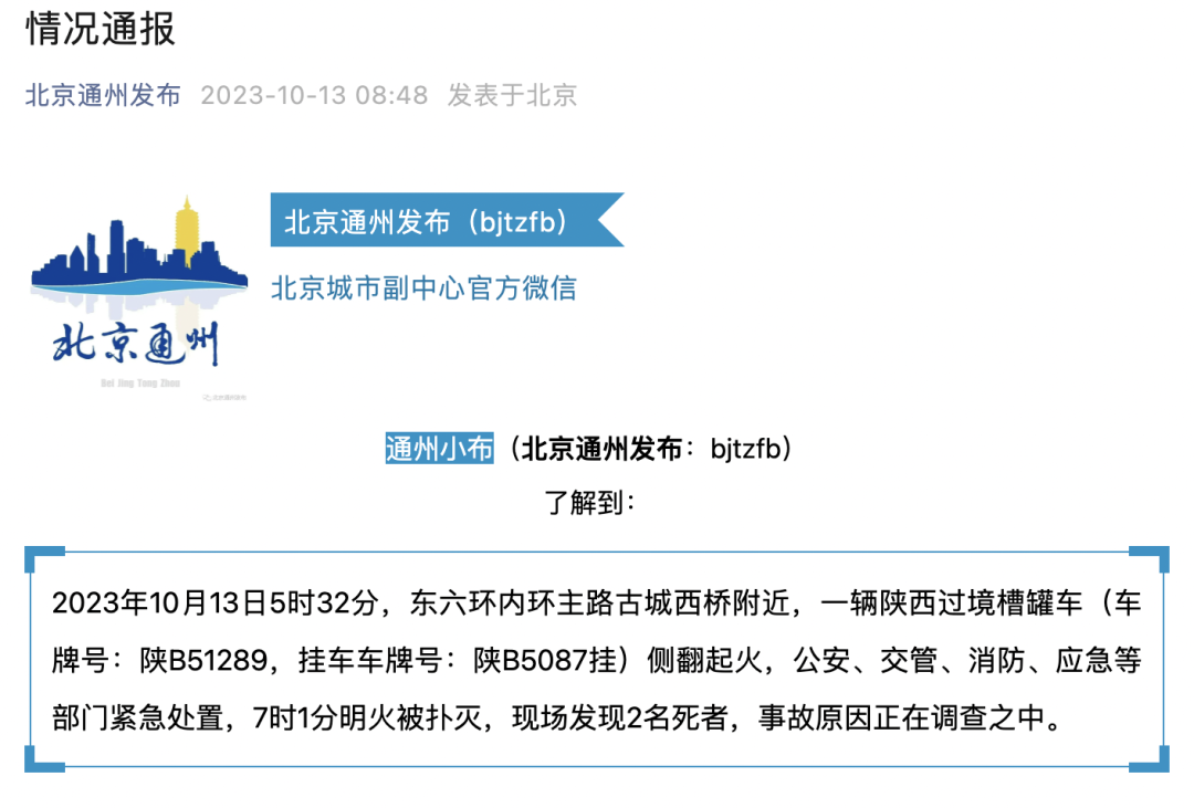 2023年10月13日5时32分,北京市东六环内环主路古城西桥附近,一辆陕西过境槽罐车(车牌号:陕B51289,挂车车牌号:陕B5087挂)侧翻起火,公安、交管、消防、应急等部门紧急处置,7时1分明火被扑灭,现场发现2名死者,事故原因正在调查之中。