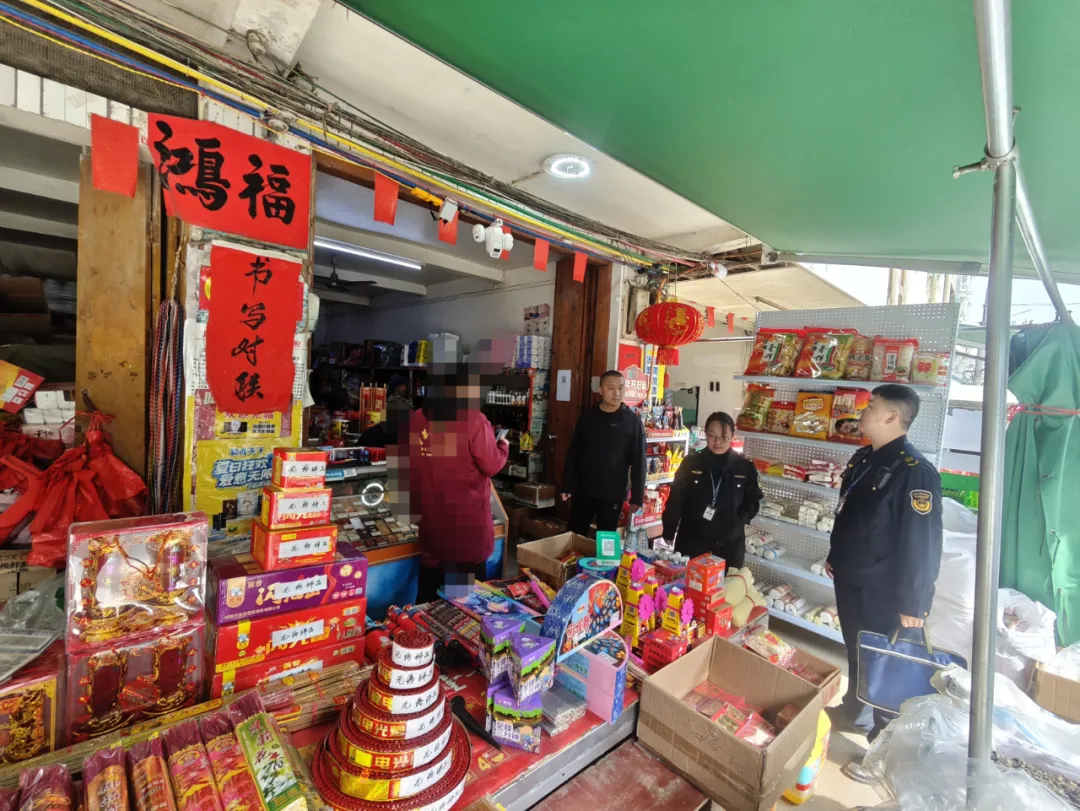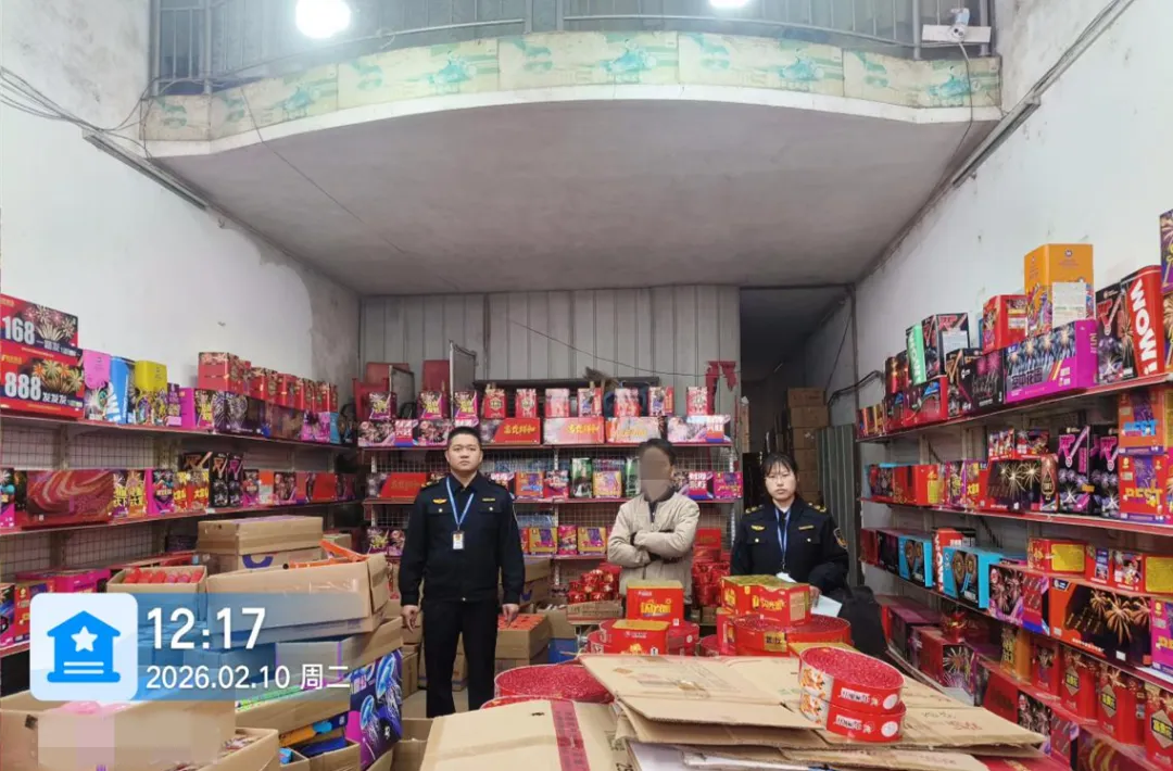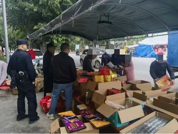 2026年2月16日,桂林市荔浦市联合检查组在荔城镇荔平路巡查时,发现一年货摊点在城区人流密集公共场所非法售卖烟花爆竹产品。执法人员当场收缴非法烟花爆竹70件。目前案件正在审理中。