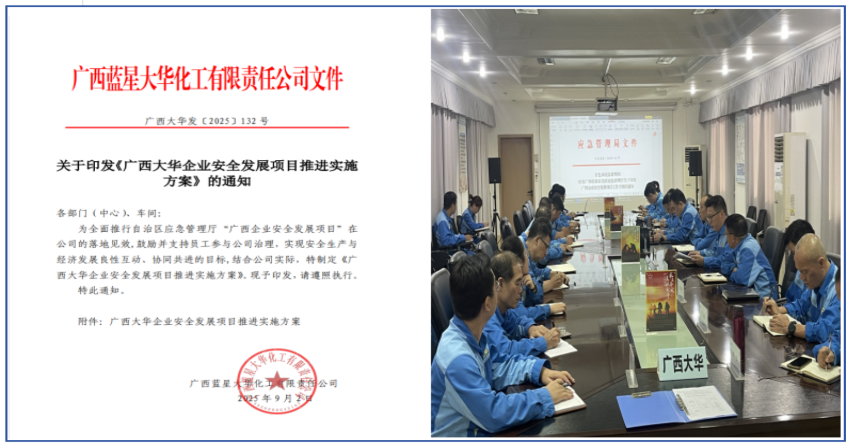 2025年8月,广西大华化工主动引入广西企业安全发展项目,并将其视为打破管理壁垒、激活基层细胞的重要契机。该公司迅速召开动员部署会,印发专项实施方案,建立专项机制,构建起一套制度化、可持续的员工参与和公司激励平台。