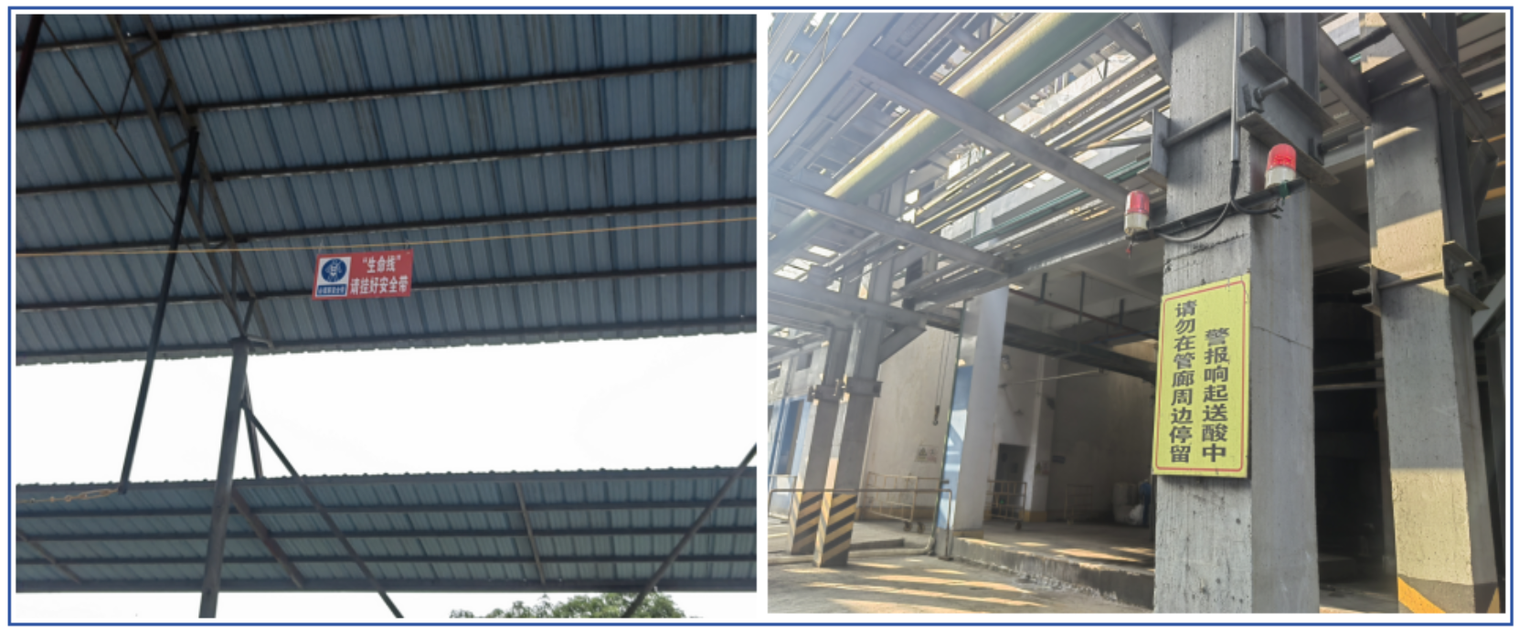 图为高空作业“生命线”提示牌和浓硫酸输送联动声光报警器装置