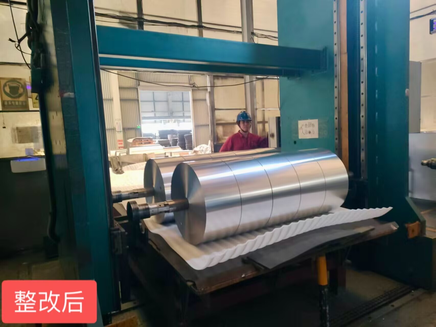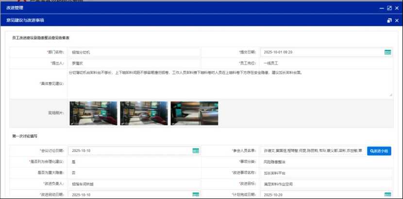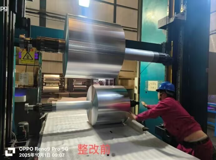 很快,一个来自生产一线的“金点子”引起了管理层重视:2025年10月1日,铝箔车间分切机主操工罗属欢反映,车间分切机卸料平台长度不足,导致卸料效率低下,且人员在料卷下方作业时安全距离不足,存在铝卷掉落伤人风险。隐患上报后,公司改进小组迅速行动,经实地勘察和讨论,确定了加长卸料平台的改造方案并立即实施。