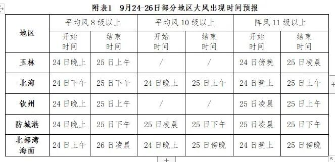 台风“桦加沙”24—25日对桂南有严重风雨影响,北部湾海面最大阵风可达12~13级;桂东南及沿海最大阵风11~12级,北部湾海面、沿海地区及桂南、桂西有大雨到暴雨,局地大暴雨或特大暴雨(过程累计雨量80~150毫米、局地300毫米以上),局地1小时降雨量80毫米以上,北海、钦州、防城港、玉林等地台风气象灾害风险高,海上过往船只和作业人员需及时回港避风防范,局地强降雨引发的城乡积涝、山洪等次生灾害并做好防风加固工作。
