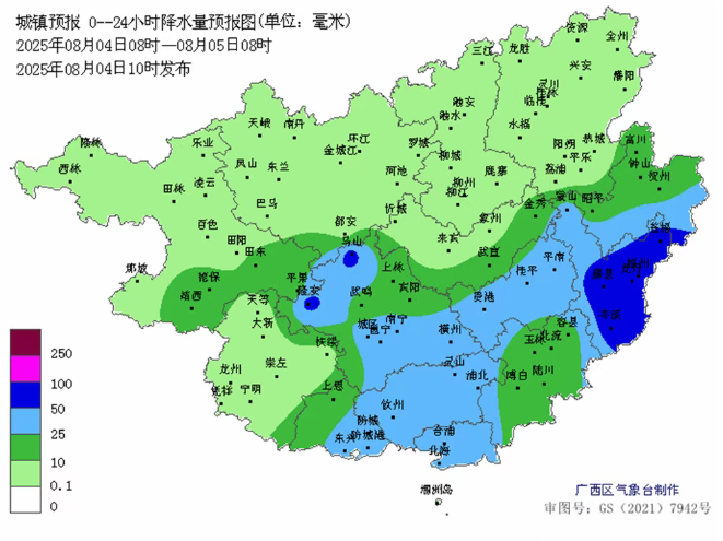 8月3日8时到4日8时,广西出现比较分散的降雨,呈现面弱点强的特点,最大降雨量出现在柳州市融水苗族自治县三防镇洞马村(254.4毫米,特大暴雨)。