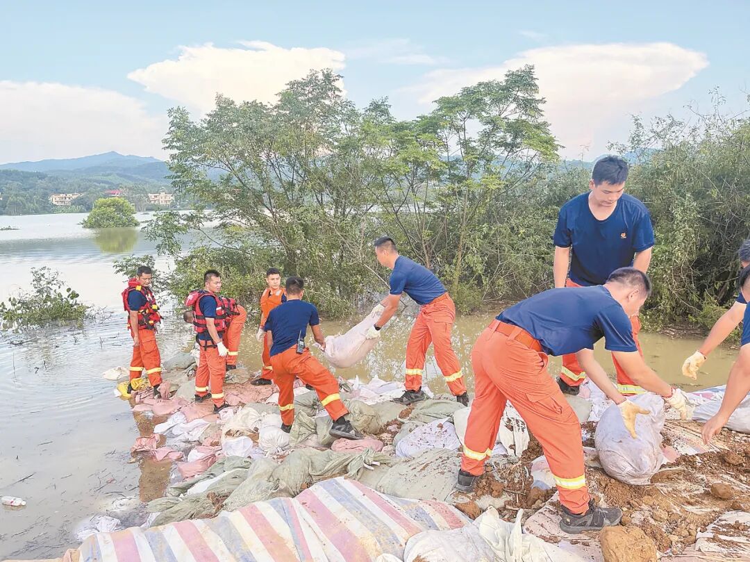 9月12日,为防御持续上涨的郁江水位,贵港市抢险救援队伍在武思江堤坝装运沙袋,对堤坝加高加固。广西云-广西日报记者 周珂 通讯员 曾航满/摄
