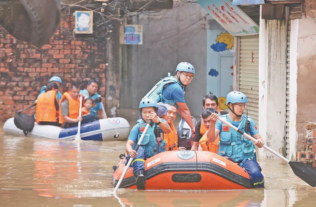 在南宁市江南区亭子村11组,江水倒灌进村,应急管理部门、蓝天救援队等紧急出动帮助村民转移。黄云/摄