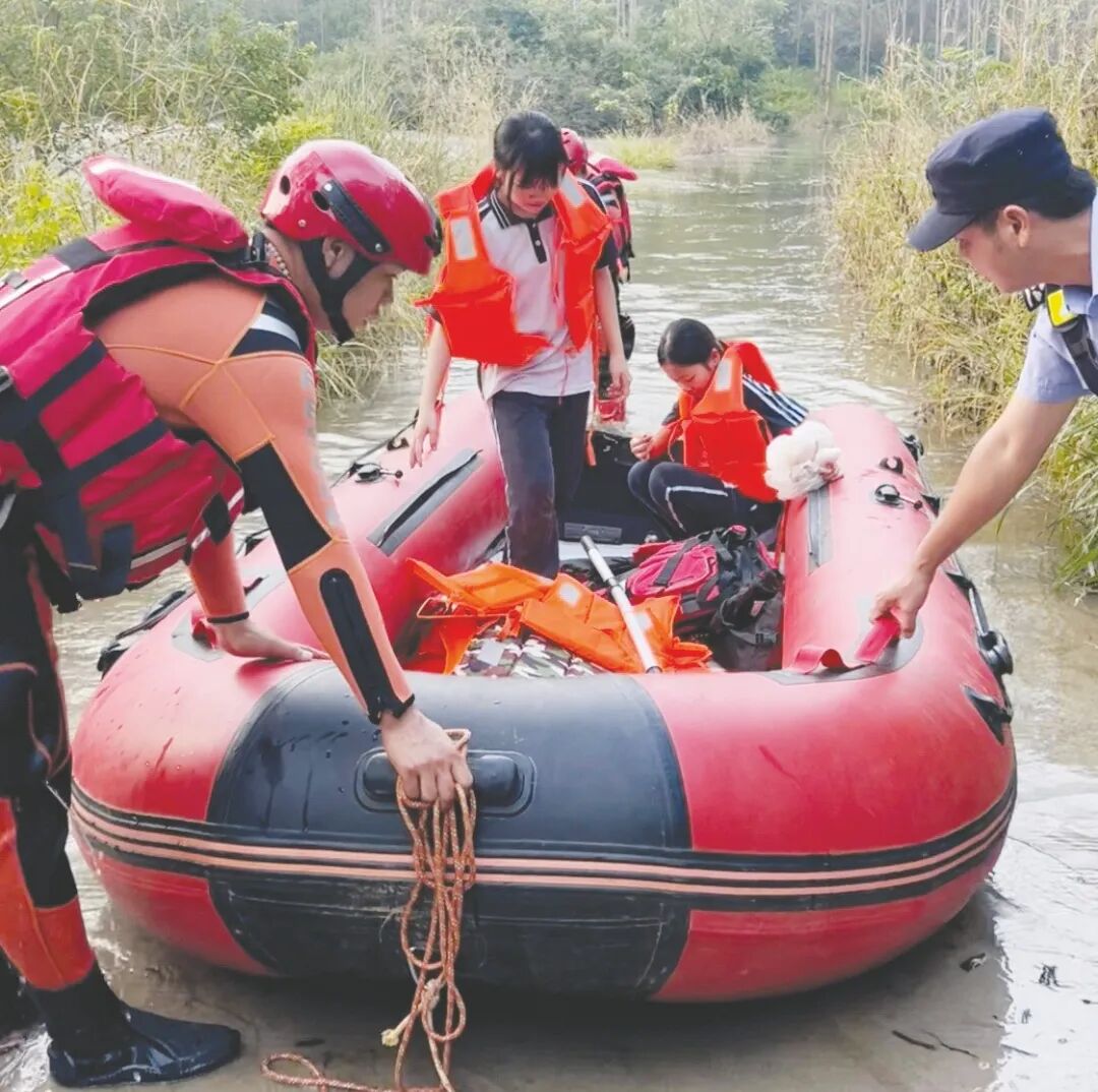 10月9日清晨,天刚蒙蒙亮,五塘镇民政村的积水已没过小腿。城区应急队、五塘派出所及镇政府干部组成“护送小队”,蹚着浑浊的积水,小心翼翼地把学生一个个抱到皮划艇上,将学生们安全准时地送达学校。