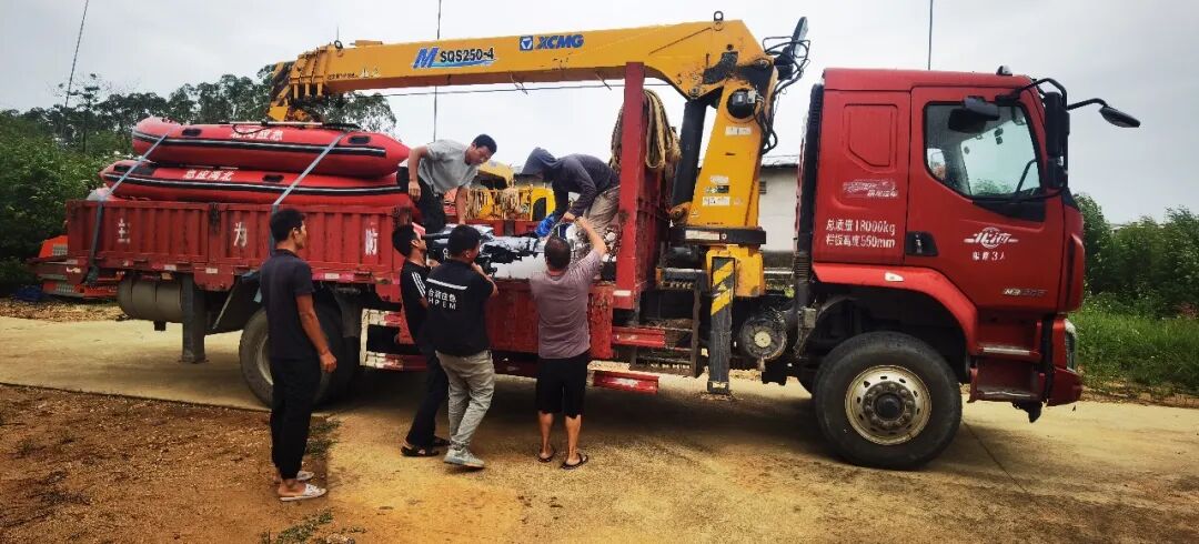 合浦县应急管理局工作人员协助吊装冲锋舟、橡皮艇