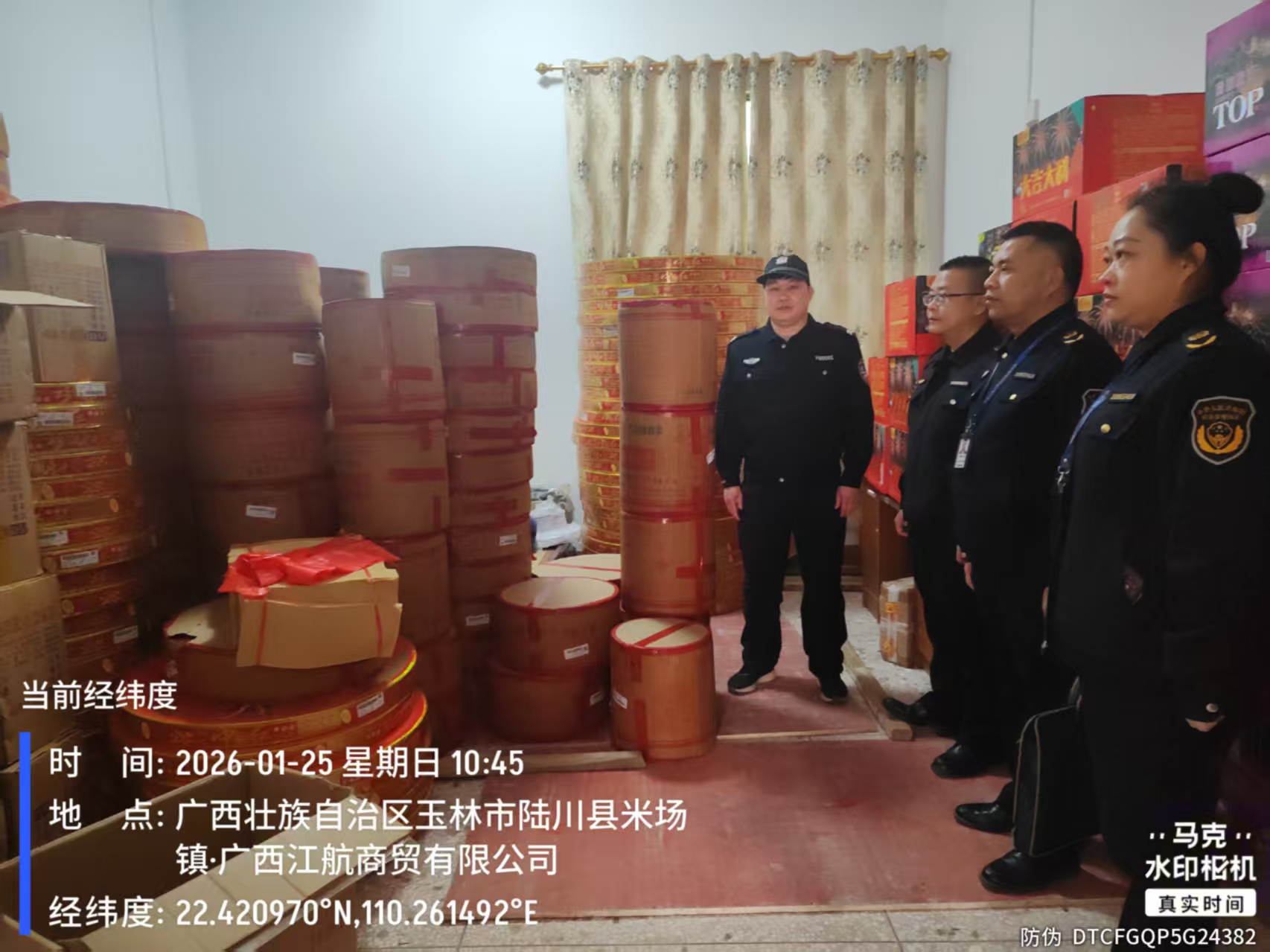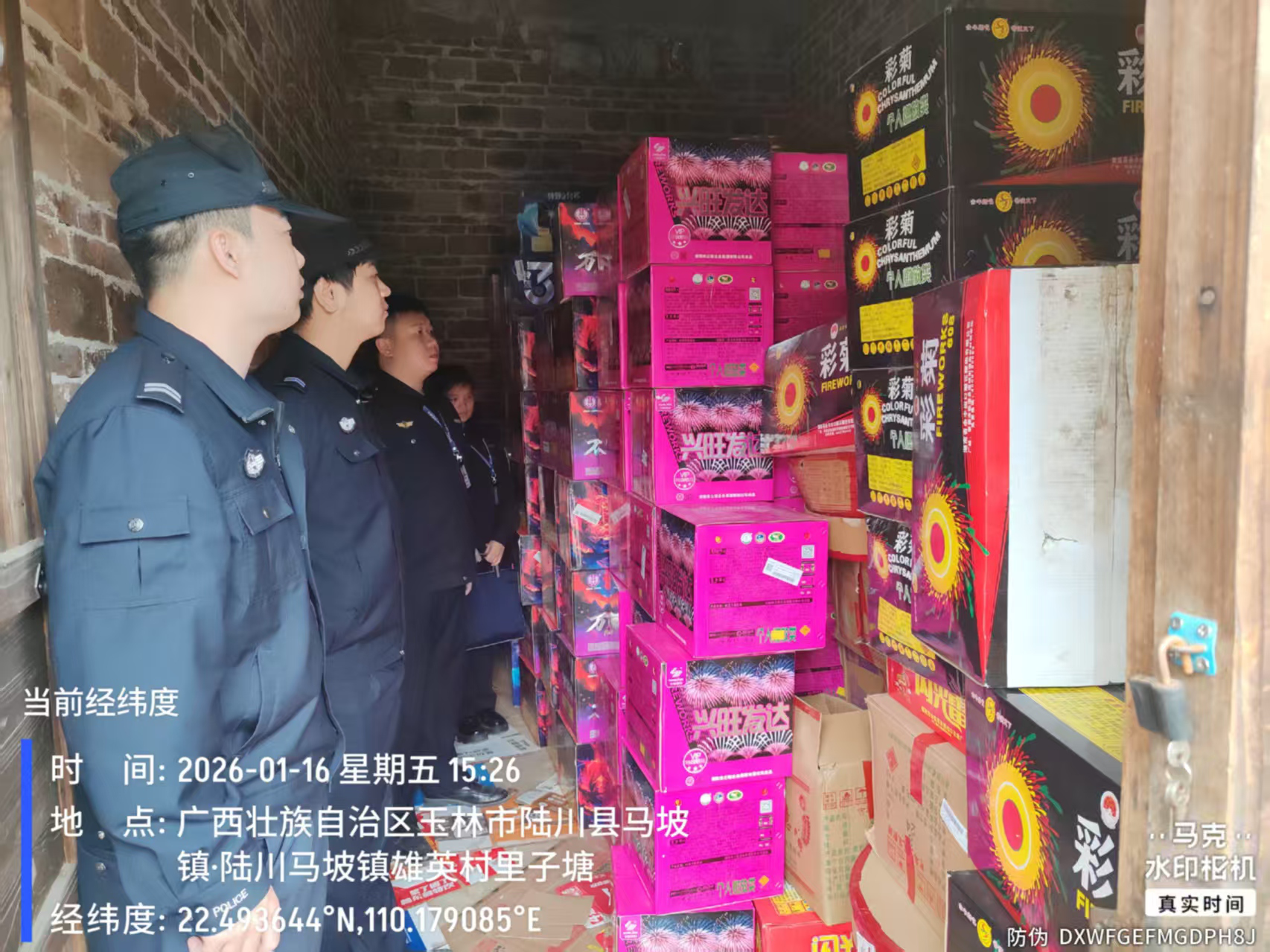 案例六:1月15日,根据群众举报线索,玉林市陆川县应急管理局联合县公安局治安大队对陆川县马坡镇木灰垌村一处嫌疑场所进行检查,发现该处涉嫌非法经营、储存烟花爆竹,现场查缴来源不明非法烟花爆竹产品44件。目前,陆川县应急管理局已依法对该批非法烟花爆竹产品进行扣押,案件正在进一步调查中。