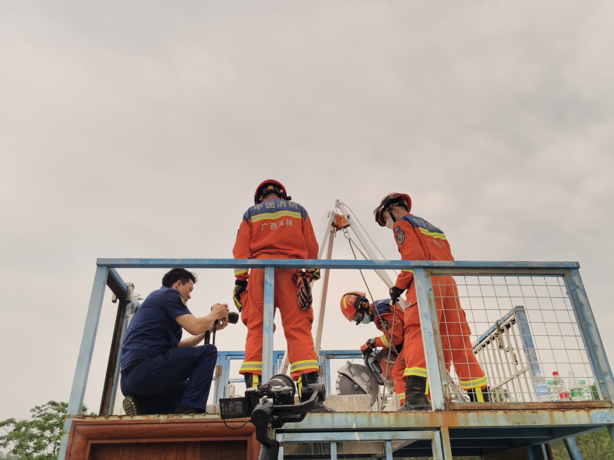 救援队员利用破拆工具组打通垂直救援通道。
