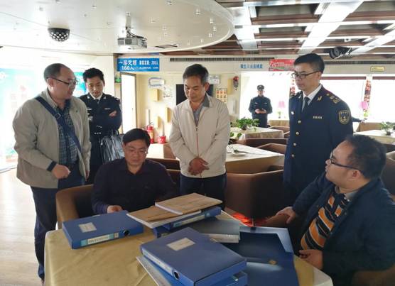 图为督查组在检查柳州市金湾水上旅游客运有限公司安全生产资料台账