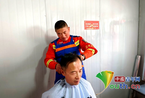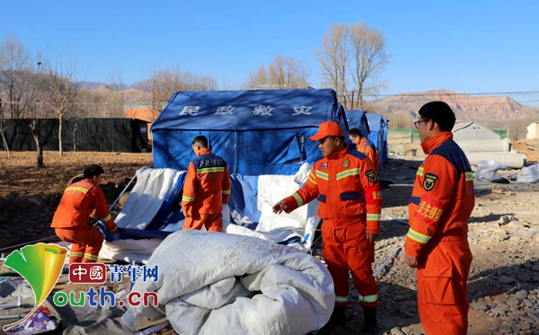 图为灾后消防救援大队为无家可归的人民群众搭建帐篷。石肖 摄