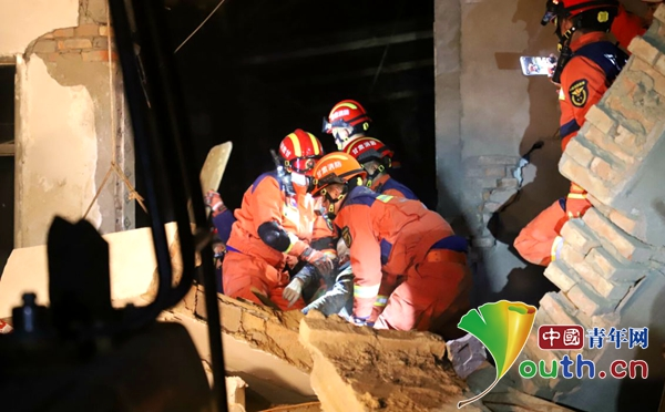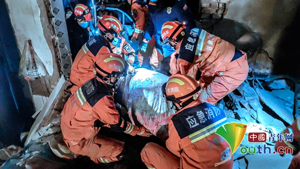 图为消防救援大队发现被困者并进行营救。石肖 摄