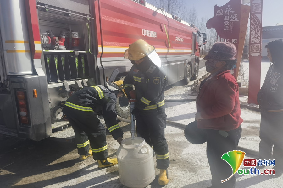 2023年1月24日(大年初三),该县安集镇部分村社因干旱等因素用水困难,大队出动消防车为安集镇安家湾村给人民群众送水,保证群众过年期间用水。石肖 摄