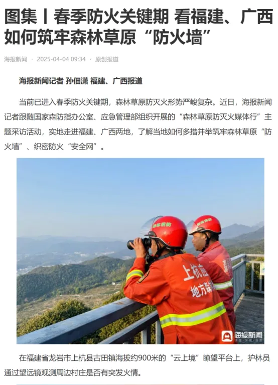 春防紧要期,森林草原火灾诱因多、风险高,防灭火形势严峻复杂。为推动做好森林草原防灭火工作,切实筑牢森林草原火灾群防群治的人民防线,国家森防指办公室、应急管理部近日组织开展“森林草原防灭火媒体行”主题采访活动,邀请人民日报、新华社、中央广播电视总台、光明日报、经济日报、中国青年报、人民网、中国青年网、新京报、南方都市报、红星新闻、海报新闻、中国应急管理报、中国减灾杂志等20余家媒体网站赴福建、广西等地,深入采访报道各地落实国家森防指、应急管理部部署,在森林草原防灭火新质能力建设、管控野外火源、加强监测预警、加密检查巡查、教育引导群众安全用火等方面的经验做法,营造“管控火源、共护绿色”的浓厚氛围。