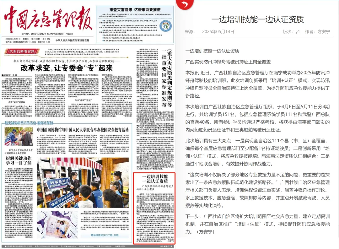 工作成效获《中国应急管理报》报道近日,广西壮族自治区应急管理厅在南宁成功举办2025年防汛冲锋舟驾驶技能培训班。此次培训创新采用“培训+认证”模式,实现防汛冲锋舟驾驶员全自治区持证上岗全覆盖,为提升防汛应急救援能力提供了新路径。