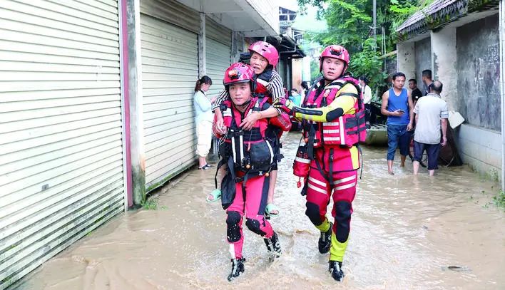 消防救援人员在广西柳州三江侗族自治县转移受困群众。