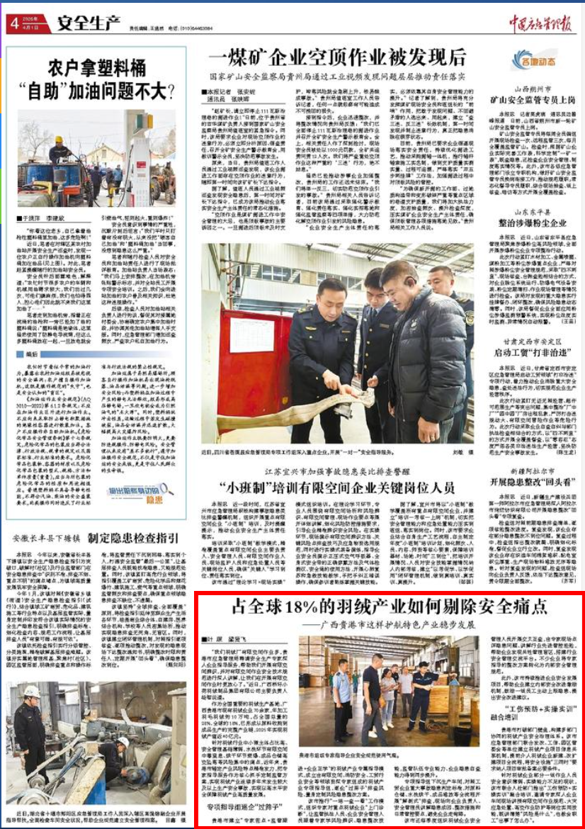 《中国应急管理报》2026年4月1日第4版刊发文章《占全球18%的羽绒产业如何剔除安全痛点——广西贵港市这样护航特色产业稳步发展》,全文如下——