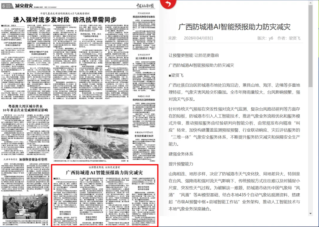 《中国应急管理报》2026年4月3日第6版刊发文章《让预警更智能 让防范更靠前 广西防城港AI智能预报助力防灾减灾》,全文如下——