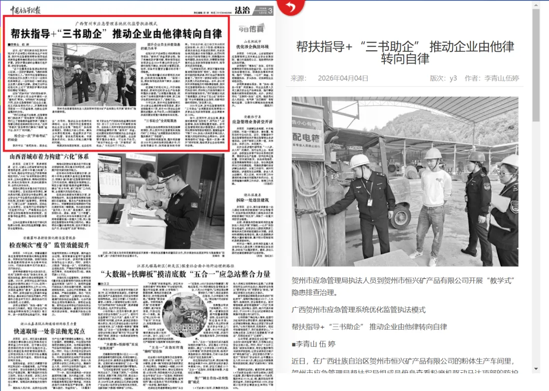 《中国应急管理报》2026年4月4日第3版刊发文章《广西贺州市应急管理系统优化监管执法模式 帮扶指导+“三书助企” 推动企业由他律转向自律》,全文如下——