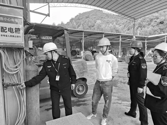 “这个位置是设备高速运转的核心区域,一旦防护罩破损,飞溅的碎屑可能伤到工人。”贺州市应急管理综合行政执法支队负责人宁光云一边用手机拍照取证,一边向站在一旁的该企业负责人庞维文讲解。庞维文边听边在笔记本上记下“更换防护罩并加装防松螺栓”的建议。