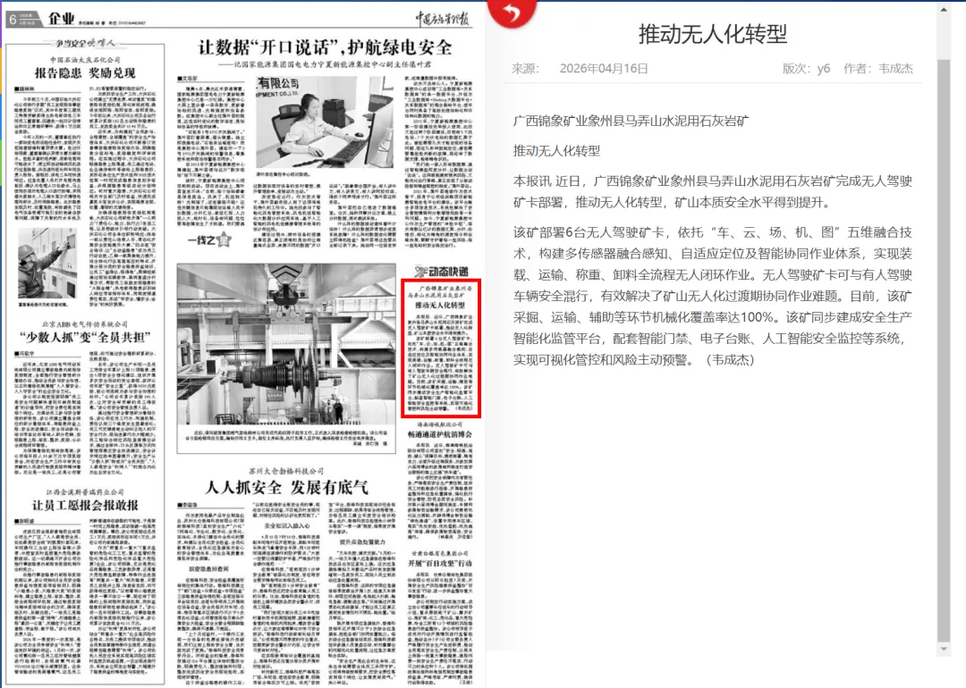 《中国应急管理报》2026年4月16日第6版刊发文章《广西锦象矿业象州县马弄山水泥用石灰岩矿 推动无人化转型》,全文如下——