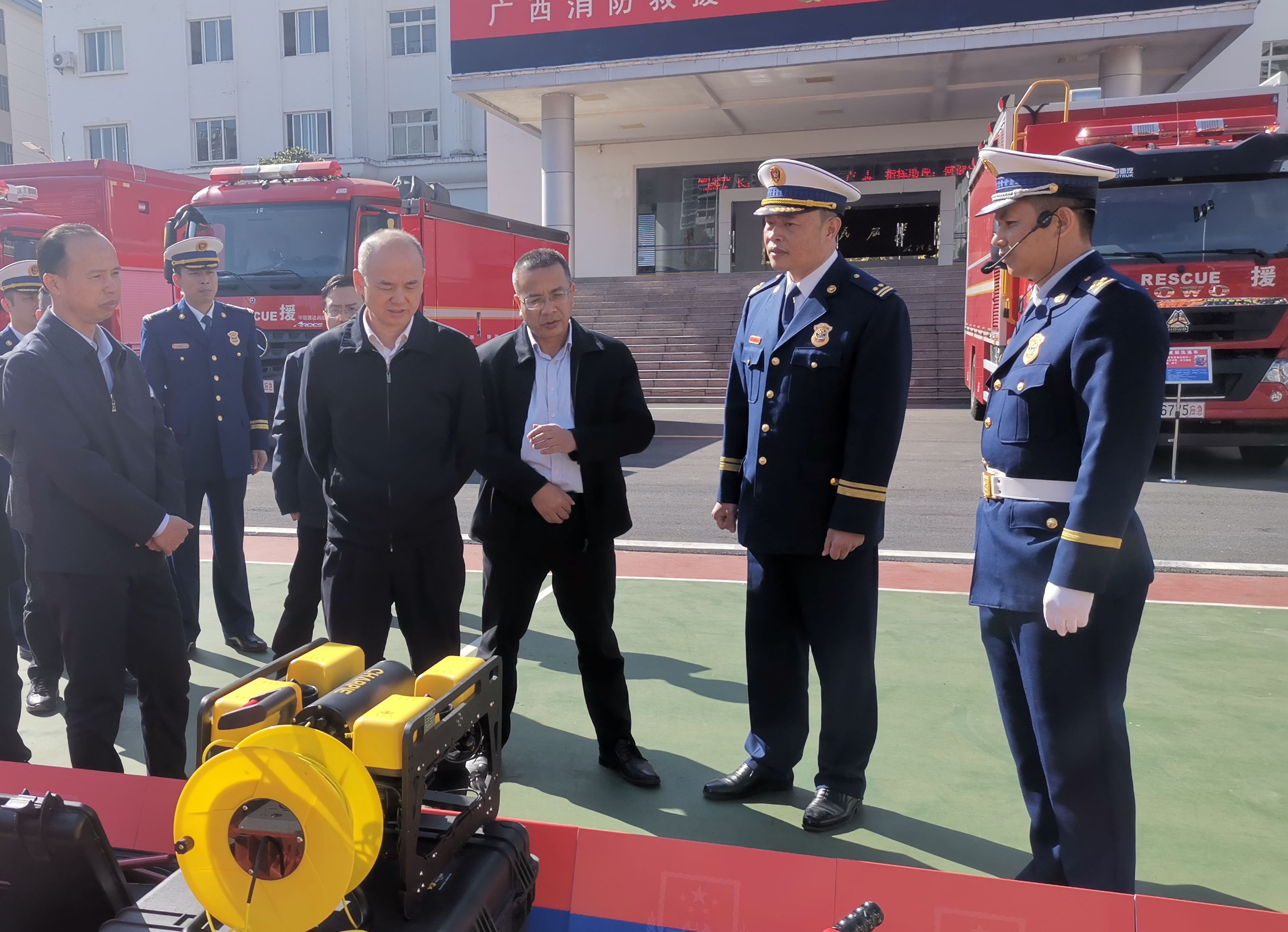 调研组在贺州市消防救援支队实地查看消防救援装备情况。