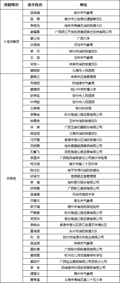 为深入贯彻落实党的二十大关于推动公共安全治理模式向事前预防转型的决策部署,持续增强公众安全意识和防灾避险、自救互救能力,持续营造“人人讲安全、个个会应急”的浓厚氛围,2023年11月30日,自治区安委办、自治区党委宣传部、自治区教育厅、自治区科技厅、自治区自然资源厅、自治区应急管理厅、广西消防救援总队、自治区地震局以及自治区气象局等9部门联合印发了《关于举办2024年广西壮族自治区第一届“桂在安全”应急管理科普讲解大赛的通知》,在全区部署开展应急管理科普讲解大赛。2024年6月27日,2024年广西壮族自治区第一届“桂在安全”应急管理科普讲解大赛决赛在南宁成功举行,来自各市预赛的前3名优秀选手以及区直单位优秀选手共44名参加了决赛。经过预赛、决赛等阶段,评选出了“十佳讲解员”10名、优秀奖34名,现将大赛结果予以公布。