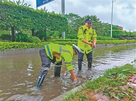 9月7日,钦州市公安局交警支队民辅警抓紧清理排水渠淤泥、杂草等堵塞物。李绿绿/摄
