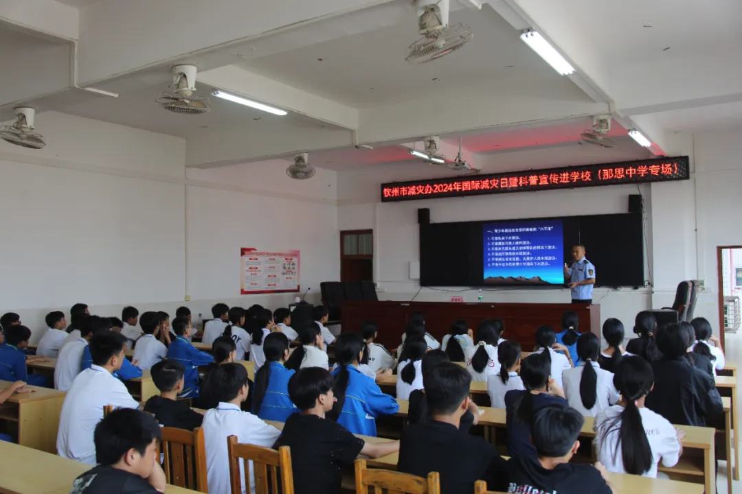 在那思中学,钦州市应急管理局专业人员为学校师生作了题为《中学生防灾减灾知识》的专题讲座,讲解了强降雨、台风引发的洪涝灾害、地质灾害等次生灾害产生的原因及避险措施;遭遇地震时各种场所正确避险方法、学校如何开展地震应急疏散演练;防溺水、交通安全、燃气安全等。
