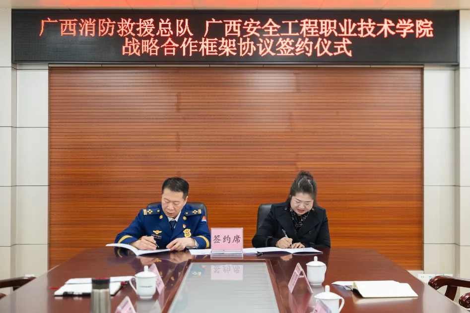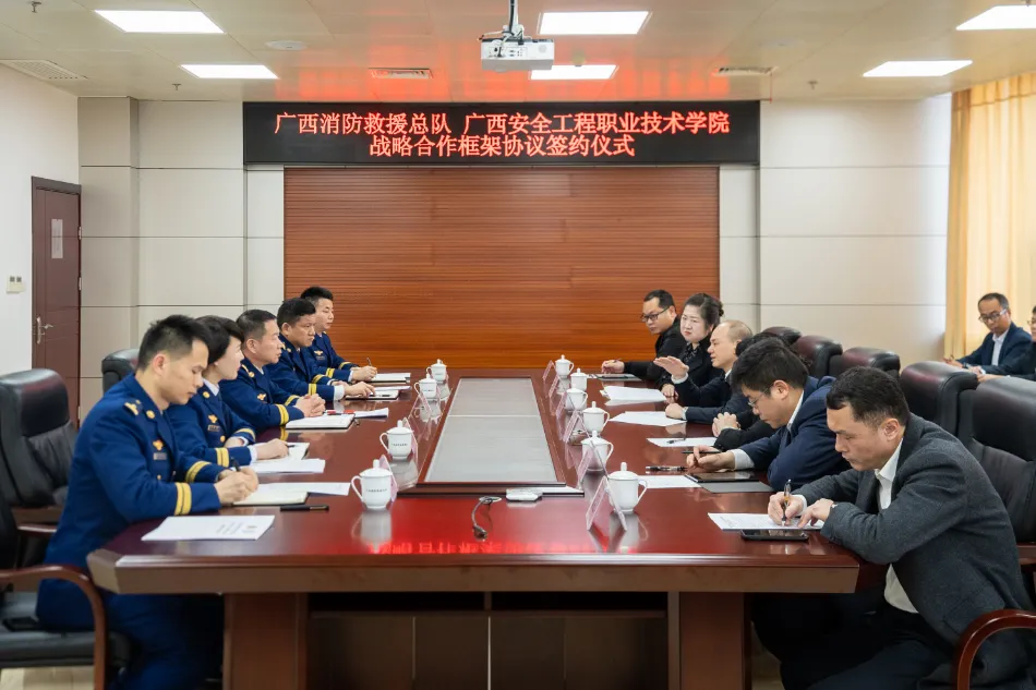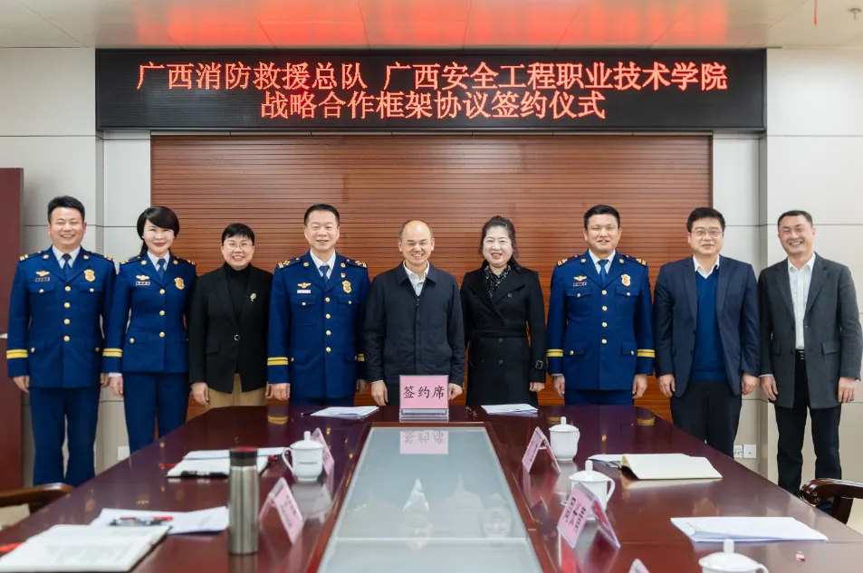 2月28日,广西消防救援总队与广西安全工程职业技术学院签订战略合作框架协议,双方决定在人才培养、实习实训、专业建设、消防安全与应急救援培训、消防救援技术研发、就业招录等方面开展交流与合作,推动双方共同发展。自治区应急管理厅党委书记、厅长周长青,广西消防救援总队党委书记、政委魏广军出席签约仪式。