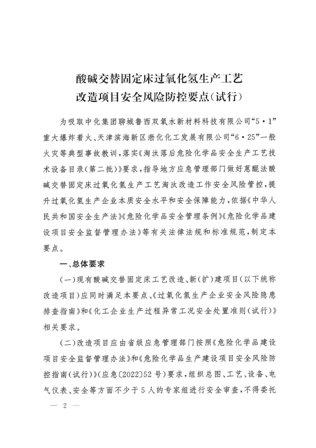 《酸碱交替固定床过氧化氢生产工艺改造项目安全风险防控要点(试行)》的通知
