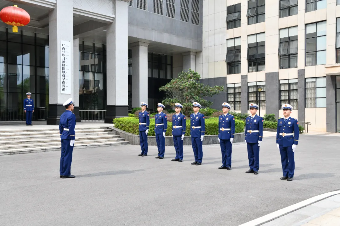 此次军事化训练采取动态组训、分队分区的方式开展,主要涵盖军姿军容、队列训练、着装规范等项目。在训练场,参训人员集中观摩学习了广西消防救援总队国旗班的队列展示。