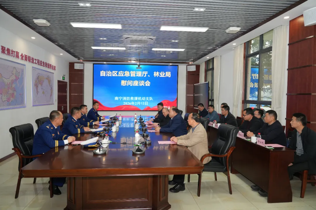 慰问期间,周长青、蔡中平一行与支队党委班子进行座谈,详细了解指战员生活、训练和工作情况,以及需要协调解决的困难和问题。座谈中,周长青高度评价了南宁消防救援机动支队过去一年的工作成绩。他指出,面对严峻复杂的灾害风险形势,支队全体指战员牢记使命、冲锋在前,圆满完成了森林火灾扑救、防汛抗洪、地质灾害救援等多项急难险重任务。同时,支队积极参与全区应急演练、联合值班值守及森林防灭火督查等工作,为全区应急管理体系和能力现代化建设作出了重要贡献,有力维护了人民群众生命财产安全,获得了自治区党委、政府及社会各界的广泛认可。