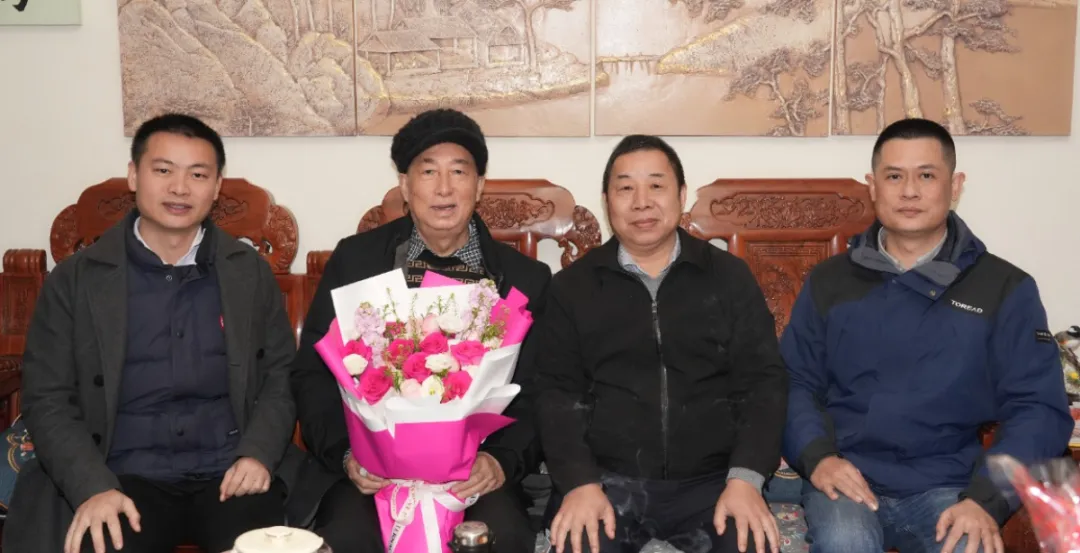 图为周长青一行为退休老干部韦干送上鲜花以及新春祝福并一同合影