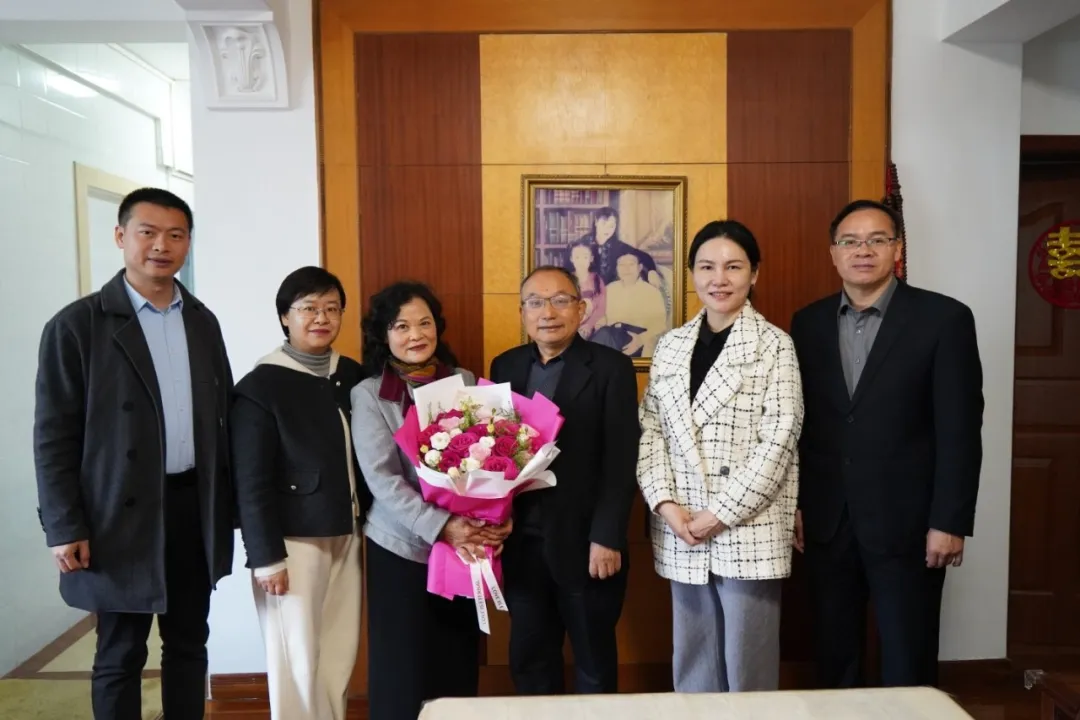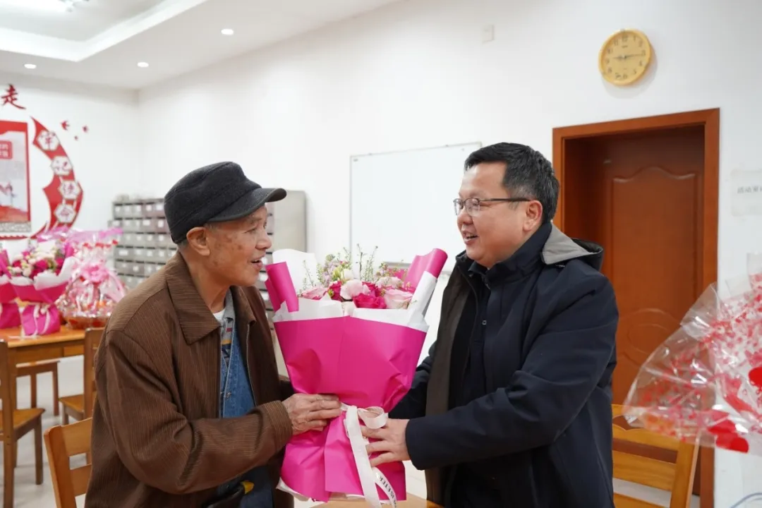 图为黄红一行为退休老干部方建新及家属送上鲜花并合影留念