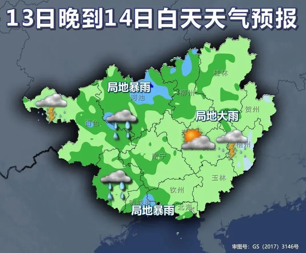 14日白天,防城港、崇左、百色、玉林等市有中雨、局地大雨或暴雨,其他地区多云到阴天有阵雨或雷雨、局地中雨。
