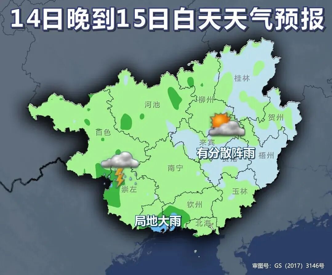 14日晚上到15日白天,沿海和桂西有阵雨或雷雨、局地大雨,其他地区多云有分散阵雨或雷雨。