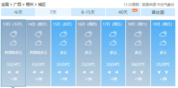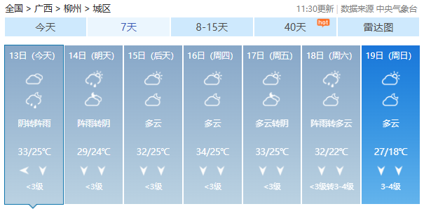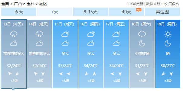 气象部门预计,13日白天到晚上桂东、桂南部分地区有中雨、局地大雨或暴雨;其他地区阴天有阵雨或雷雨,局地大雨。