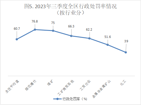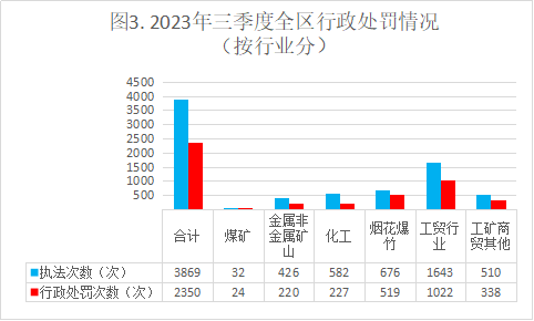 三季度全区共实施执法次数3869次、行政处罚2350次、行政处罚率60.7%,其中煤矿分别为32次、24次、75%,金属非金属矿山分别为426次、220次、51.6%,化工分别为582次、1227次、39%,烟花爆竹分别为676次、519次、76.8%,工贸分别为1643次、1022次、62.2%,工矿商贸其他分别为510次、338次、66.3%。详见图3、图4、图5、图6。