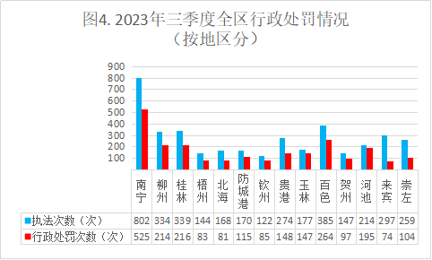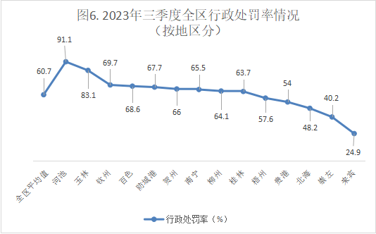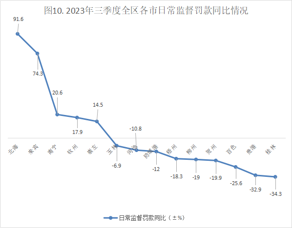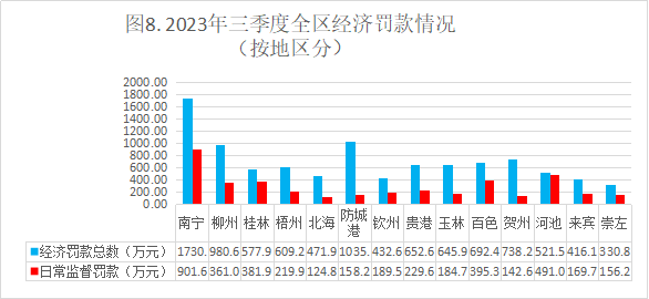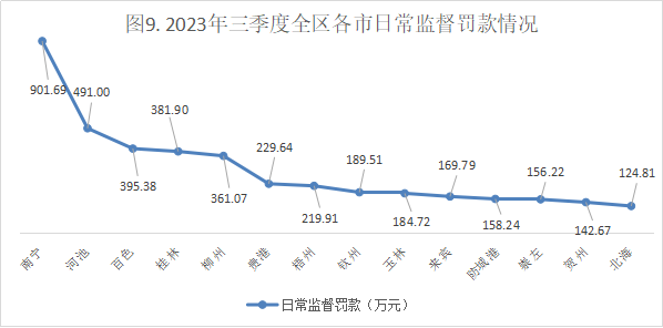 (1)三季度日常监督处罚罚款排在全区前3的市为:南宁市(901.69万元)、河池市(491万元)、百色市(395.38万元);日常监督罚款最小的3个市为:北海市(124.81万元)、贺州市(142.67万元)、崇左市(156.22万元)。