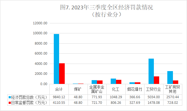三季度全区共实施经济处罚罚款9840.12万元,其中对煤矿罚款48.8万元,对金属非金属矿山罚款771.93万元,对化工罚款1048.29万元,对烟花爆竹罚款366.66万元,对工贸罚款5034万元,对工矿商贸其他罚款2570.44万元。详见图7、图8。