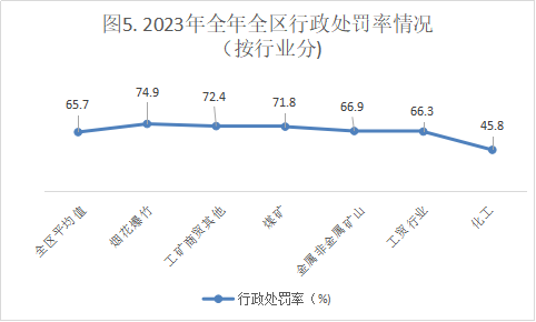 2023年全年全区共开展执法次数5378次、行政处罚3533次、行政处罚率65.7%,其中煤矿分别39次、28次、71.8%,金属非金属矿山分别593次、397次、66.9%,化工分别755次、346次、45.8%,烟花爆竹分别802次、60174.9%,工贸分别2442次、1620次、66.3%,工矿商贸其他分别747次、541次、72.4%。详见图3、图4、图5、图6