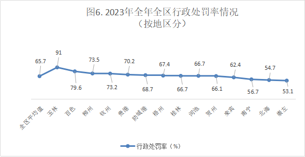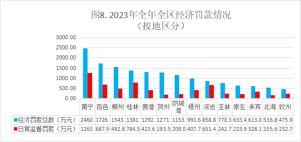2023日常监督处罚罚款排在全区前3市为:南宁市(1263.3万元)、桂林市(784.5万元)、百色市(687.99万元);日常监督处罚罚款最小的3个市为:北海市(155.69万元)、贺州市(193.57万元)、防城港市(209.09万元)。