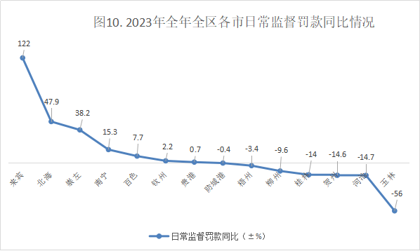 日常监督处罚罚款同比上升的有7个市:来宾市、北海市、崇左市南宁市、百色市、钦州市、贵港市详见图9、图10