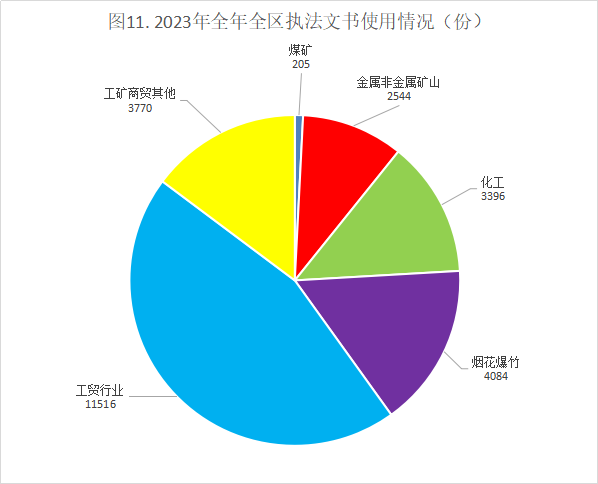 2023年全年全区各市县应急管理部门共下达各类执法文书25515份。详见图11