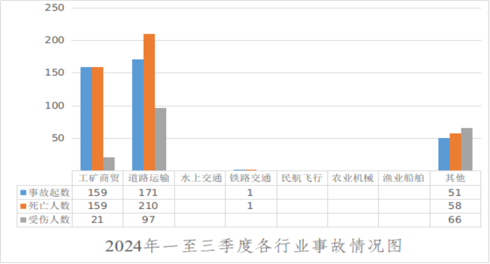 今年一至三季度,全区发生各类事故382起、死亡428人、受伤184人,同比事故起数、死亡人数减少105起、93人,下降17.85%、11.22%,受伤人数增加12人、上升6.98%。其中较大事故18起、死亡64人、受伤24人,同比事故起数、死亡人数、受伤人数增加2起、6人、3人,上升12.5%、10.34%、14.29%。没有发生重大及以上事故。