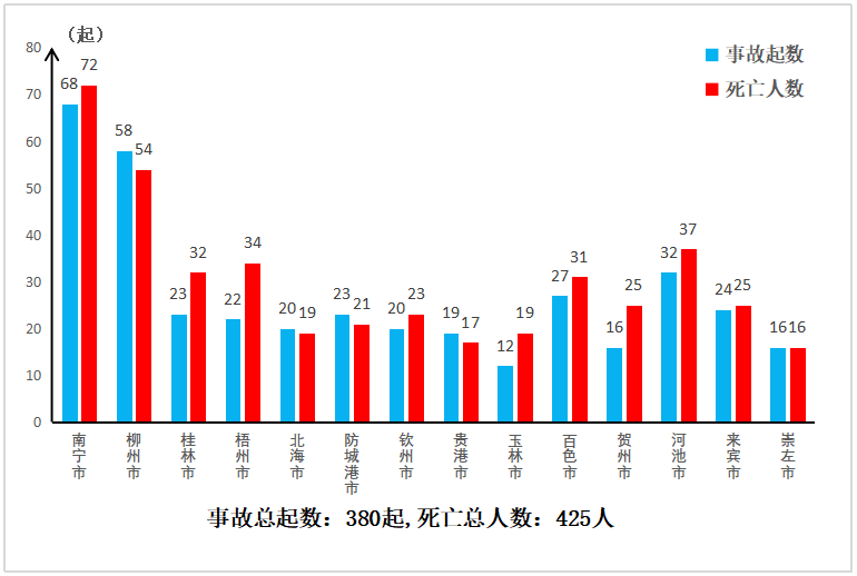 1—10月份,柳州、河池2个市事故起数、死亡人数同比“双上升”,受伤人数同比下降;贺州市事故起数同比下降,受伤人数、死亡人数同比双上升;梧州市事故起数同比下降,死亡人数同比上升,受伤人数同比持平;桂林、北海、玉林、来宾4个市事故起数、死亡人数同比“双下降”,受伤人数同比上升;钦州市事故起数、受伤人数同比“双下降”,死亡人数同比上升;南宁、防城港、贵港、百色、崇左5个市事故起数、死亡人数和受伤人数同比“三下降”。贺州市发生较大事故4起、死亡15人、受伤5人;桂林市发生较大事故3起、死亡9人、受伤10人;梧州市发生较大事故2起、死亡11人、受伤2人;南宁市发生较大事故2起、死亡6人、受伤1人;玉林市发生较大事故1起、死亡4人、受伤3人;钦州市发生较大事故1起、死亡3人;河池市发生较大事故1起、死亡3人;其余7个市未发生较大事故。