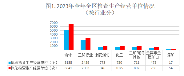 2023年全年全区各级应急管理部门共检查生产经营单位5188个,检查生产经营单位6641次。