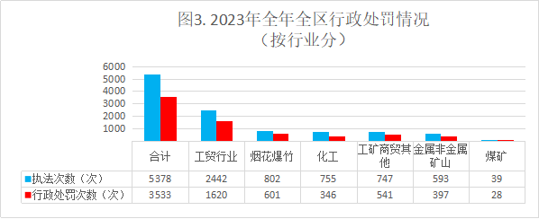 2023年全年全区共开展执法次数5378次、行政处罚3533次、行政处罚率65.7%,其中煤矿分别为39次、28次、71.8%,金属非金属矿山分别为593次、397次、66.9%,化工分别为755次、346次、45.8%,烟花爆竹分别为802次、601次、74.9%,工贸分别为2442次、1620次、66.3%,工矿商贸其他分别为747次、541次、72.4%。详见图3、图4、图5、图6。