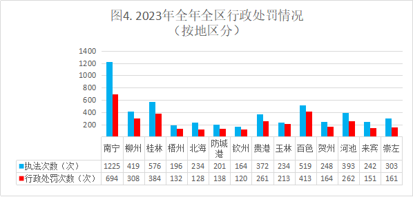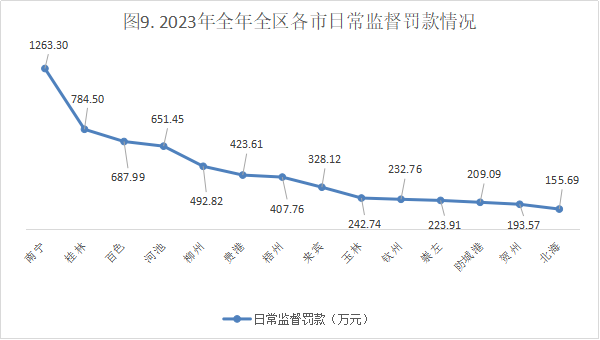 2023年日常监督处罚罚款排在全区前3的市为:南宁市(1263.3万元)、桂林市(784.5万元)、百色市(687.99万元);日常监督处罚罚款最小的3个市为:北海市(155.69万元)、贺州市(193.57万元)、防城港市(209.09万元)。